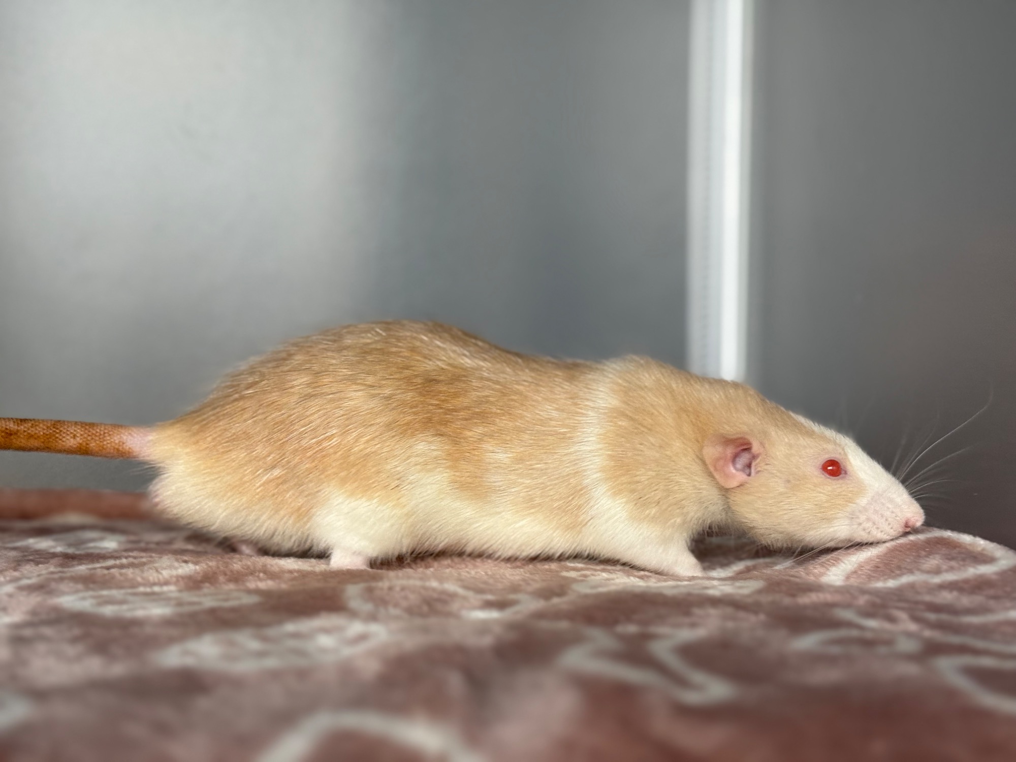 Mâle ambre cap stripe blazed dumbo lisse, yeux rose - né le 17/06/2025. Eleveur, Rattery Knabbelhooek en Belgique.