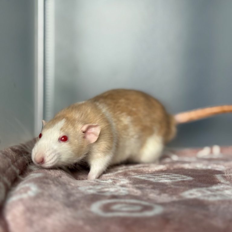 Chez nos amis les rats il y a une infinité de couleurs que vous pourrez découvrir sur le site ci-dessous. Ici vous aurez un mâle de couleur TOPAZE avec un marquage cap stripe berkshire, des oreilles dumbo, des yeux rouges et un poil lisse.